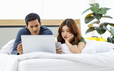 Asian upset stressed depressed frowning face male female husband and wife couple lay down together on pillow under blanket on bed having debt problem making payment shopping online via credit card