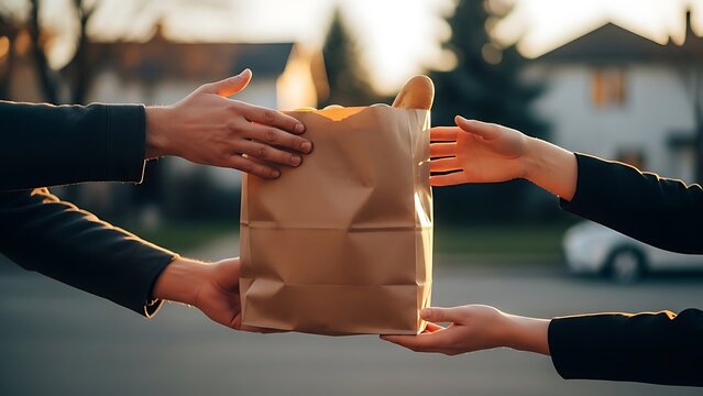 Friendly delivery person handing a package to a customer during a sunny day at the doorstep