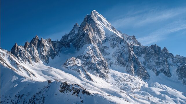 A breathtaking view of the Mont Blanc massif, showcasing its snow-covered peaks against a clear blue sky.