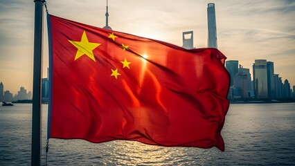 Chinese flag waving in front of city skyline at sunset