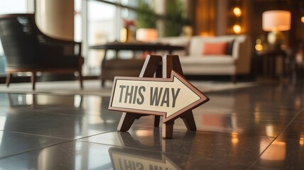 Directional signboard standing on polished floor in luxurious hotel lobby with modern furniture and soft lighting