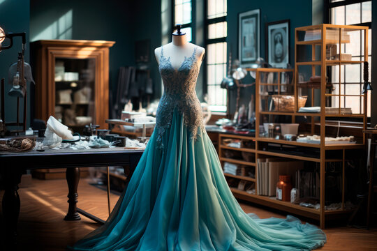 Haute couture evening dress in a sewing workshop