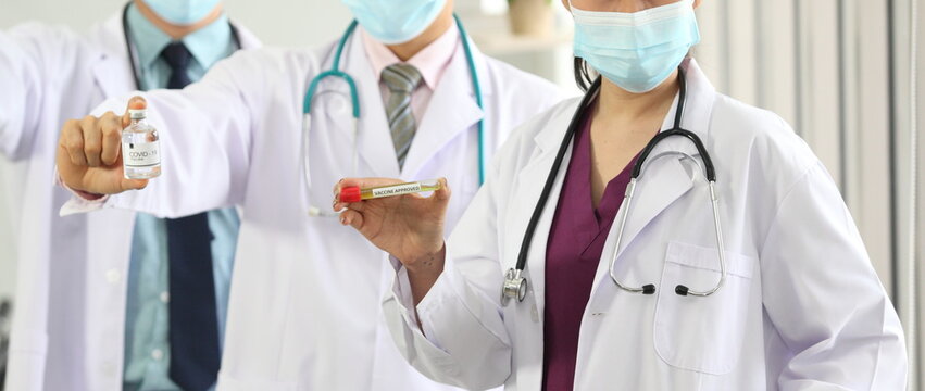 Doctor examines the blood tube of the diseased for coronavirus or covid 19 in the laboratory office. Female medical worker wearing medical protective uniform