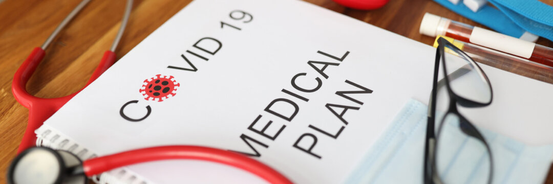Medical journal with covid 19 sign lie on medical office table backround closeup. Reopening new normal lifestyle concept