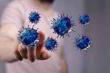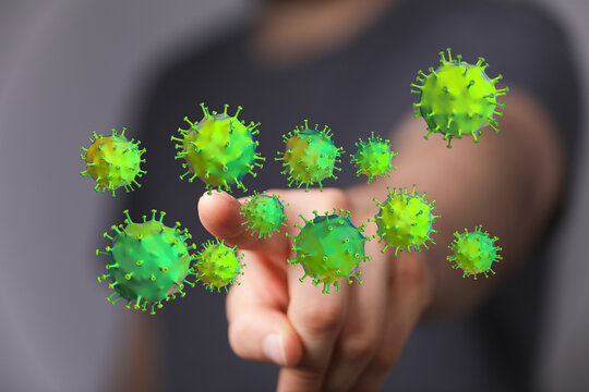 Close-up of a hand pointing at floating virus illustration. Science, medicine and health concepts with coronav
