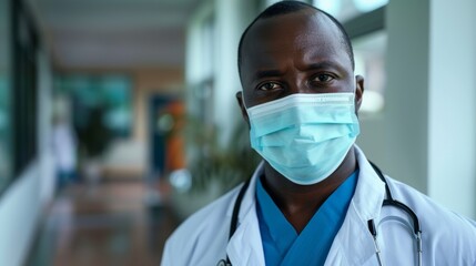 Dr. Covid wears mask for safety, precaution, and cleanliness in hospital or clinic. Male doctor, healthcare expert, and pandemic frontline worker.