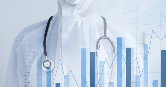 Composition of covid 19 cells and medical data processing over caucasian woman wearing face mask