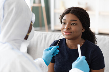 Pediatrician taking nasal test sample from child at home during lockdown