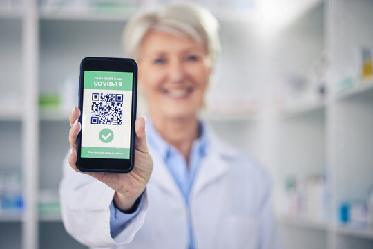 Woman, pharmacist and phone with QR code scan for covid certification or verification at pharmacy. Hands of female person, medical or healthcare professional show mobile smartphone app for approval