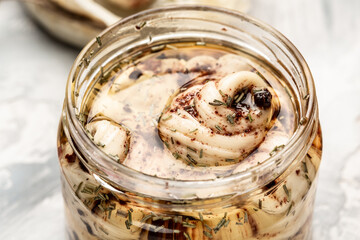iraqi traditional cheese made from buffalo milk. Cheese in marinade with olive oil, chili and basil, hand made