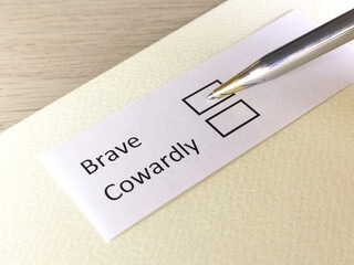 One person is answering question on a piece of paper. The person is thinking to be brave or cowardly.