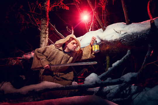 Medieval monk in canvas sackcloth robe with sword and lattern in dark forest and red light of moon on winter night. Fantasy or fairy tale about wandering monk. Forces of good and evil in world