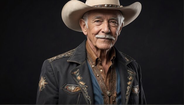 handsome elderly male fashion model on cowboy outfit close-up portrait posing on plain black background from Generative AI