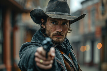 Western movie shot, front view of a cowboy ready to do a duel in middle of a wild west town pointing gun to camera, Generative AI