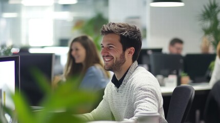Diverse team collaborating over tablet and desktop in modern open-plan office