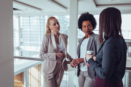 Diverse female coworkers talking and networking in modern open-plan coworking space