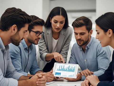Diverse business team collaborating on a project, analyzing data on a tablet for success