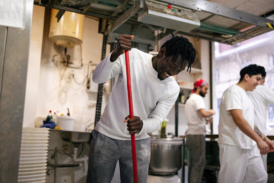 Smiling man in a cleaning service uniform with colleagues in the background, indicating a professional cleaning team at work.