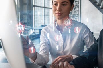 Businessman and businesswoman in formal wear working together looking for new employees to hire for international business consulting. HR, social media icons over modern panoramic office background