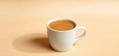 Creamy coffee in a simple white mug against a muted beige backdrop, tone, still life