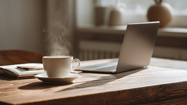 Steaming Morning Coffee on a Minimalist Wooden Desk