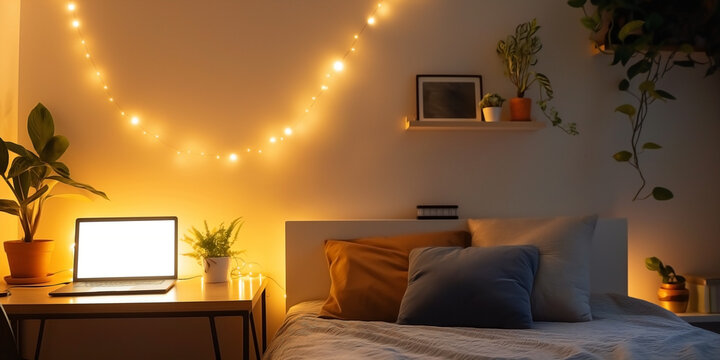 Students decorating their new dorm room, copy space, arranging furniture, dynamic, Composite, backdrop of a stylish dorm