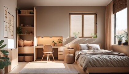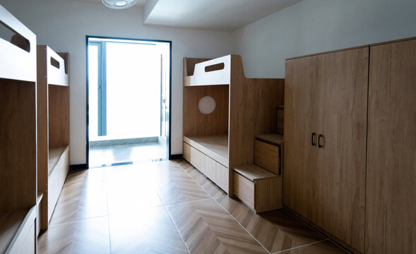 Simple student-style dorm bedroom. Hostel dormitory room. Campus