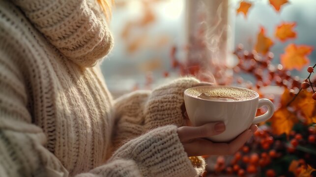 A woman in a cozy sweater holding a steaming mug of hot cocoa, in cozy indoor setting with autumn decorations