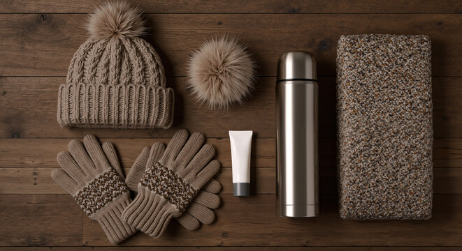 Cozy winter accessories arranged on rustic wooden surface including knit hat gloves scarf. Warm seasonal clothing items with neutral beige colors and thermal flask. Winter comfort and hygge lifestyle