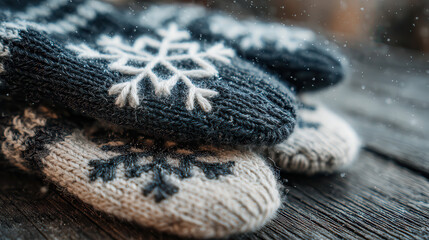 Cozy snowflake knit mittens resting on a rustic wooden surface