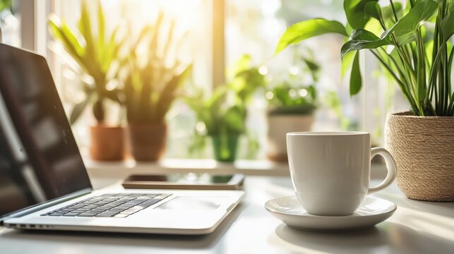 Creative workspace: coffee, tech, and innovation theme