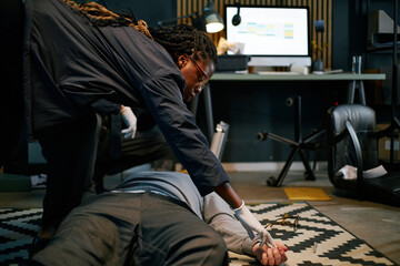 Emergency responders tending to an unresponsive person lying on the floor, demonstrating life-saving techniques. Medical equipment and first aid kits in view indicating professional intervention