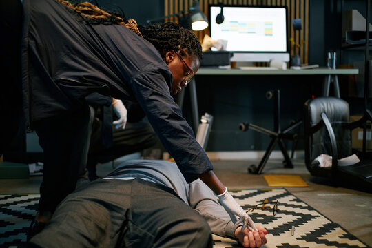 Medical professional administering aid to unconscious person lying on office floor, surrounded by modern equipment and coworker observing in background