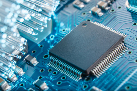 Close-up view of a microchip on a red circuit board illuminated by neon lights. The intricate electronic components and circuits are highlighted.