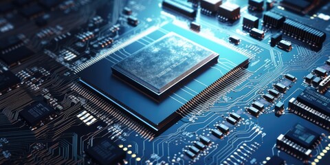 closeup on an advanced GPU ram microchip or cpu of a powerful computer board for artificial intelligence technology