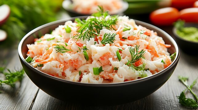 Fresh crab meat salad with dill and green onions in black bowl. Light and healthy seafood dish with vibrant herbs. National Crab Meat Day celebration of fresh coastal flavors