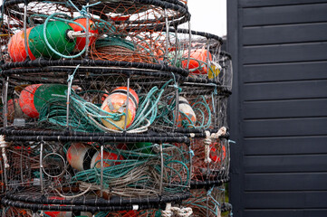 Crab pots stacked on the harbor