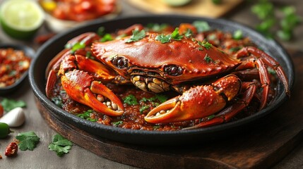Deliciously cooked crab in a pan, garnished with herbs.  Spicy and flavorful dish