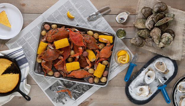 Seafood broil of oysters, crab, corn, potatoes