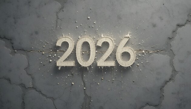 Cracked Concrete with Metallic 2026 Numbers on Gray Background