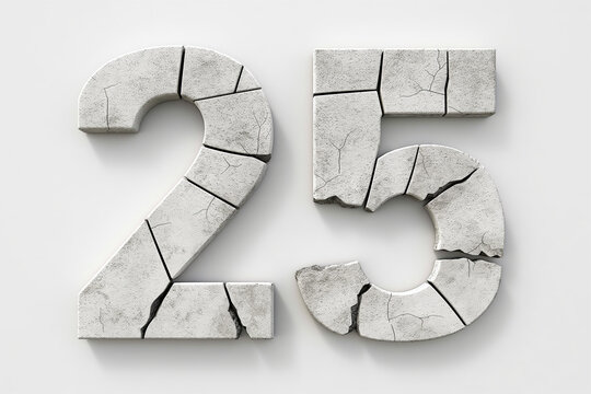 3D numerals 25 rendered in cracked concrete texture, placed on a stark white background