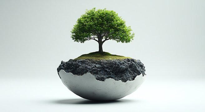 Green tree growing on a floating island of earth within a cracked eggshell growth life