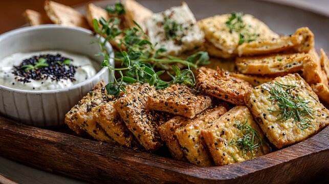 Gourmet cracker assortment with creamy dip and fresh herbs creates an elegant appetizer spread