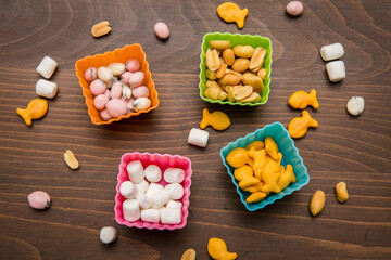 Silicone cups on wooden table holding snacks of peanuts, marshmallows, fish cheese crackers, and yogurt covered raisins - snacks scattered around