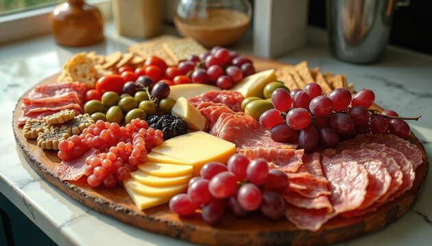 Wooden board holds an assortment of cheeses meats grapes olives crackers and tomatoes. Perfect for gatherings and parties offering a variety of delicious appetizers for guests to enjoy.
