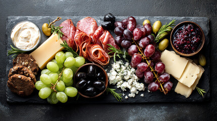 A delicious charcuterie board featuring an assortment of meats, cheeses, fruits, and spreads arranged artfully.
