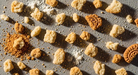 Assorted Cookie and Cracker Pieces on Gray Surface with Dust