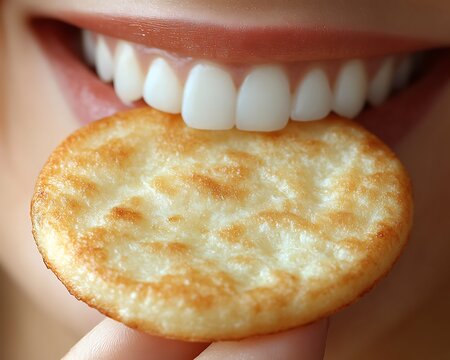 Close-up of a person taking a bite of a round, lightly browned cracker