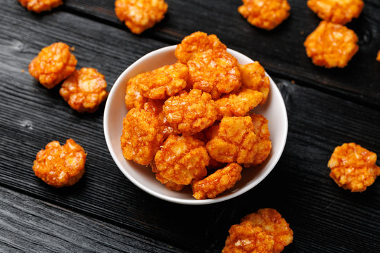 Crunchy mix of pretzels and crackers in wooden bowl isolated on white
