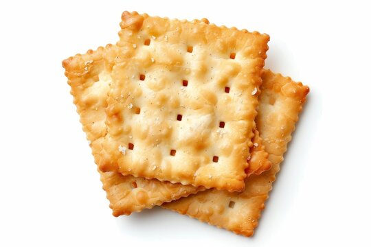 Small pile of saltine or square soda crackers isolated on white background. soup crackers isolated. Wheat water crackers isolated.